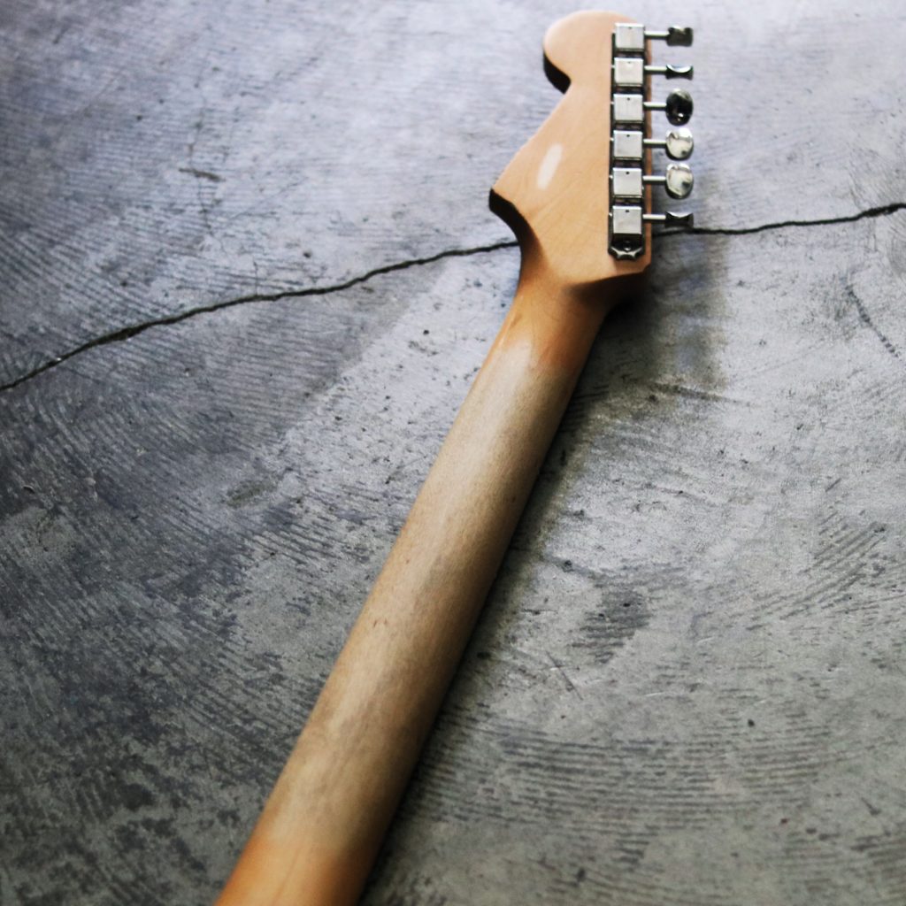 ネックは新品のフェンダーメキシコのネックですが、カスタムショップで”はじかれた”木目のネックと思われ、元々はアメリカ製、塗装がメキシコと推測しています。柾目のネックはカスタムショップで使用しており、普通の杢目はレギュラーラインで使用しているのだと思います。ただ、これはこのギターを組み上げる時に色々なフェンダーのストラトキャスターと比較した際に感じたことですので違うかも知れません。全くネックの形状、重さ、素材感が同じで柾目のネックのカスタムショップがありました。ちなみにビンテージのようなネックのフィット感をだすためにネックの裏面はUsed加工しております。